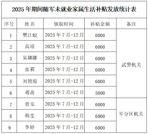 巴彦淖尔市退役军人事务局关于对2025年7月-12月巴彦淖尔市驻市部队未就业随军家属基本生活补贴拟发放人员名单的公示